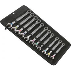 Jeu de clés mixtes à cliquet haute qualité signées Wera : Tout ce qu’une clé doit être capable de faire. Et bien davantage encore. En plus rapide, en mieux, en plus esthétique. Bref, un vrai Joker ! La nouvelle génération des clés mixtes à cliquet. Jeu de 11 pièces logées dans un robuste étui. Pour vis à tête hexagonale / écrous hexagonaux. Avec fonction de retenue assurée par une plaque métallique implantée dans la fourche, réduisant le risque d’égarer vis et écrous. La plaque métallique interchangeable située dans la fourche bloque les vis et les écrous grâce à ses dents extra-dures et diminue le risque de ripage. La butée terminale intégrée est à même d’empêcher le glissement vertical hors de la tête de vis et permet le déploiement de couples élevés. La morphologie dodécagonale engendre une liaison géométrique intime avec la vis ou l’écrou, réduisant le risque de ripage. L’angle de reprise de 30° seulement côté fourche permet d’éviter le retournement laborieux de la clé lors du vissage. Mécanisme à cliquet à denture exceptionnellement fine (80 dents) côté œillet, offrant un maximum de souplesse même aux endroits exigus. Le forgeage à géométrie spécialement étudiée assure une transmission de couple élevée et une haute résistance à la flexion. Réalisation en acier chrome-molybdène performant, avec revêtement nickel-chrome pour une haute tenue à la corrosion. Avec repéreur d'outil « Take it easy » : identification des calibres par couleur.