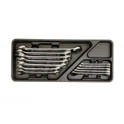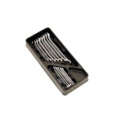 Dans module thermoformé 385 x 165 mm. CLES MIXTES Acier forgé allié au chrome et vanadium. Son traitement thermique contrôlé lui confère la dureté pour résister aux sollicitations importantes. Les ouvertures des clés sont réalisées par brochage, technologie qui permet d'obtenir des cotes très précises avec un état de surface de qualité. Le profil des têtes polygonales a été conçu spécialement pour ne pas mater les angles des écrous. Lors de l'effort, la pression ne s'exerce pas sur les angles mais sur les côtés de l'écrou. La résistance des clés Mob est largement supérieure aux spécifications des normes ISO. Résistance très supérieure à la norme. Confort d'utilisation : corps de la clé ergonomique non tranchant, permettant une bonne prise en main.Reliefs et marquages doux réalisés en forge à froid pour un confort tactile et un nettoyage facile. Angle de reprise de 30° . Inclinaison de 15° permettant une utilisation en milieux étroits. Fabriquées dans nos usines.