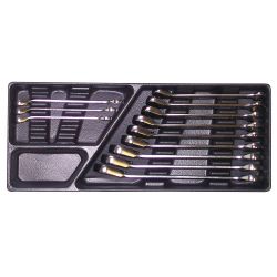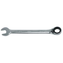 Dans module thermoformé 385 x 165 mm. Grande vitesse d'approche pour des clés à cliquet de qualité. Système à cliquet intégré : pas de risque d'inversion accidentelle. Réversibilité pour changement rapide de sens : productivité optimisée. Angle de reprise de 5° (6° pour les dimensions 8 et 9). Faible encombrement. Tête inclinée de 15°. Finition chromée et polie satinée. Acier au Chrome Vanadium, le meilleur acier pour les clés. Reliefs et marquages à chaud "soft" (doux) pour un confort tactile et un nettoyage facile. Un côté rapide avec le cliquet et un côté fourche pour serrer, dès que le blocage est atteint côté cliquet (ne pas forcer sur le cliquet).