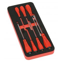 Dans module mousse bicolore 385 x 165 mm. Chaque outil a une place définie. Les outils manquants se repèrent en quelques secondes grâce au fond rouge. Mousse bi-colore haute densité, ne casse pas, ne retient pas l'humidité et résiste aux produits de l'atelier.