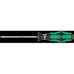 Tournevis haute qualité Kraftform Plus signé Wera, avec lame électricien. Manche Kraftform Plus multicomposants pour un travail agréable et ergonomique, bannissant ampoules et callosités. Zones dures pour une haute vitesse de travail, les zones tendres garantissant quant à elles une transmission de couple élevée. Le repéreur d'outils "Take it easy" avec repérage couleur en fonction des pointes et des poinçons de calibre, pour trouver facilement et rapidement l'outil nécessité. Le dispositif hexagonal antiroulement empêche les "échappées" importunes de l'outil sur le lieu de travail